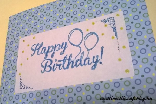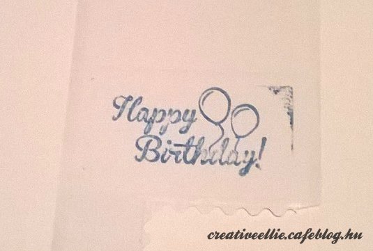 Először kivágtam a kartonból a képeslap alapját. Egy 10-szer 20 cm-es darabot vágtam, összehajtva így 10-szer 10-es lett. Aztán rányomdáztam a Happy Birthday feliratot a fehér matricára.