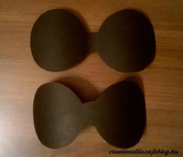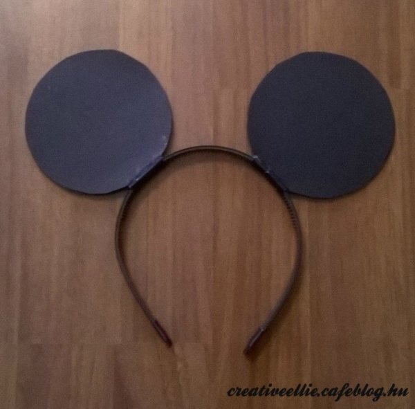 Fekete kartonra körző segítségével felrajzoltam két kört egymástól nem messze. Ha nincs körzőnk, akkor rajzoljunk körbe valamit ami kerek és kb megfelelő méretű. A köztük lévő részt nem vágtam el, mert ez került a hajpánt aljára amikor összeragasztottam. Így készítettem két fület.