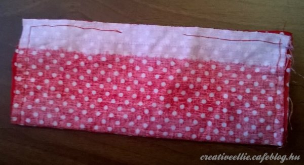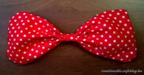 A masnihoz levágtam egy kb 15 cm hosszú, 15 cm széles darabot a pöttyös anyagból, illetve egy vékony csíkot is, mert a közepén azzal fogtam össze.