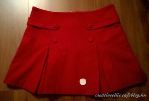 Van egy piros szoknyám, amit turkálóban vettem; tavaly ebben voltam Vilma a Scooby-Doo-ból, szóval éljen az újrahasznosítás 🙂 Már felvarrtam rá egy pöttyöt mikor rájöttem, hogy le kéne fényképezni a sima szoknyát.
