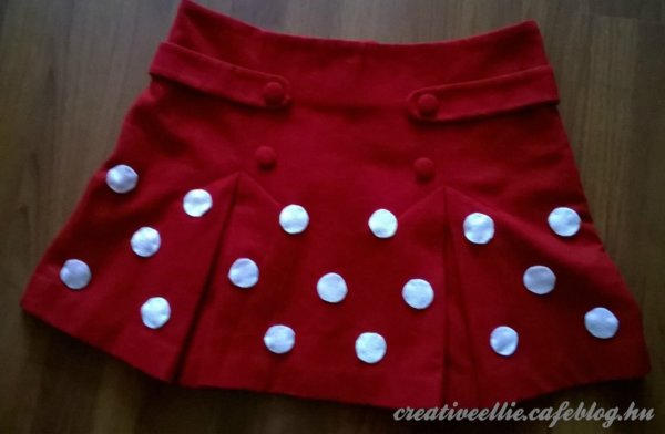 Fehér filcből kivágtam a pöttyöket és szépen elrendezve rávarrtam a szoknyára. Először persze csak rápakoltam, nézegettem, hogy hol is legyenek. Nem vittem túlzásba, minden pöttyöt négy öltéssel varrtam, így is jó sokáig tartott. Meg ha esetleg még használnám a szoknyát, akkor így könnyű leszedni róla.