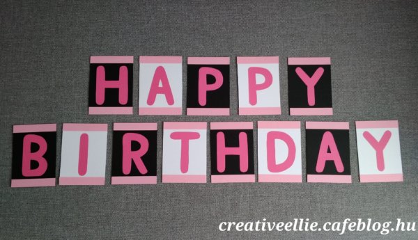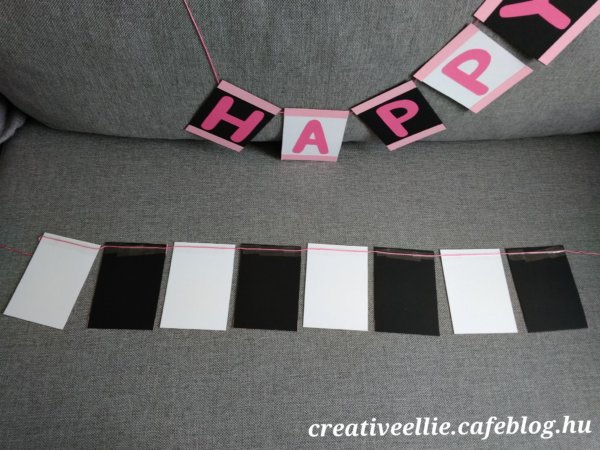 A fekete és fehér kartonokat még a rózsaszín betűk kivágása előtt feldaraboltam és rájuk ragasztottam a halvány rózsaszín csíkot. Így látszott, hogy mekkora hely marad a betűknek.