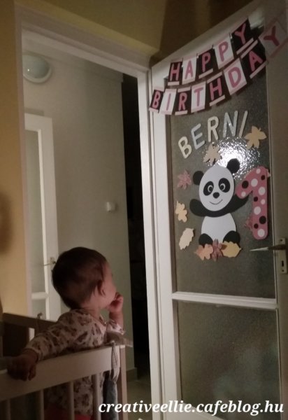 Két nappal később a feliratot újra felhasználtuk; akkor a családi szülinapozáson. Gyorsan gyártottam még egy pandát (a másikat nem akartam leszedni Berni ajtajáról, és így a szüleimnél is van egy panda). Itt Blue Tack-kel tettük föl, amit aztán nyom nélkül el tudtunk távolítani.