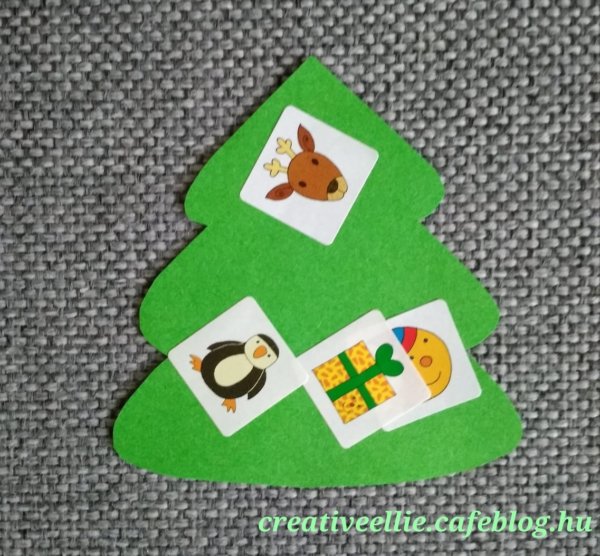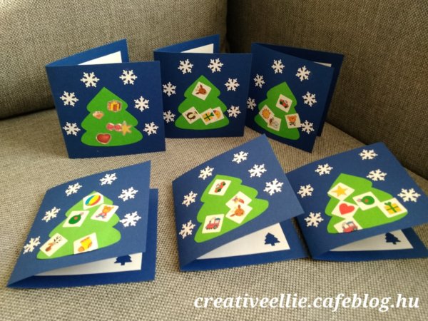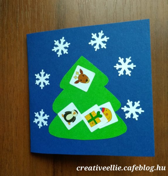Sokat gondolkoztam, hogy milyen lapokat csináljak idén. Mindenképp olyat szerettem volna, amiben a 13 hónapos kislányom is tud segíteni. Szereti a matricákat, úgyhogy végül azt találtam ki, hogy ő ragassza a matricákat (a díszeket) a fenyőfára.