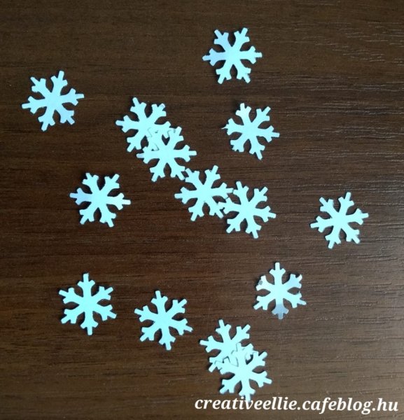 A képeslap alapja most is egy 10-szer 20 cm-es karton. Sötétkéket választottam, ezen jól mutatnak a hópelyhek. Belülre ragasztottam egy 8-szor 8 cm-es fehér lapot, amire előtte lyukasztottam egy fenyőfát.