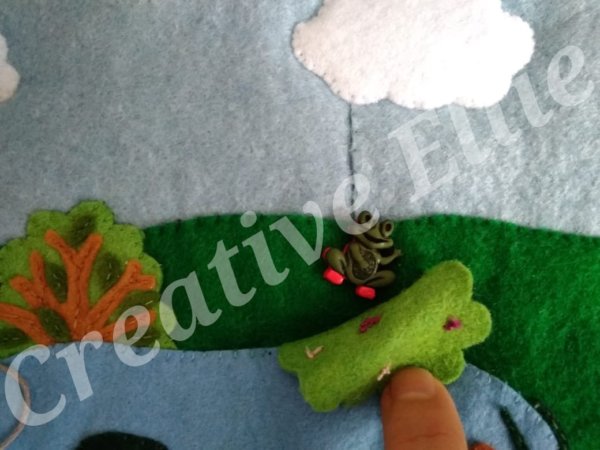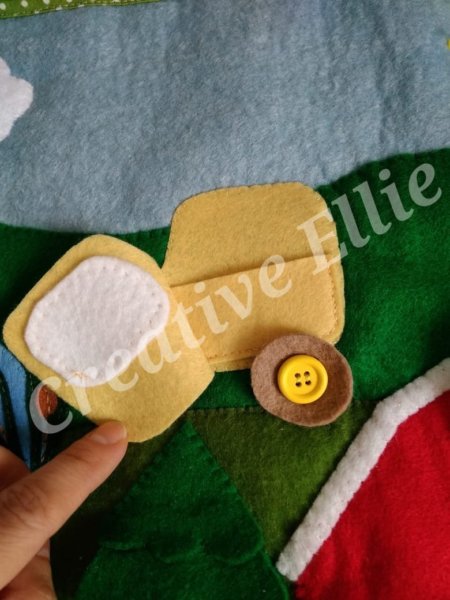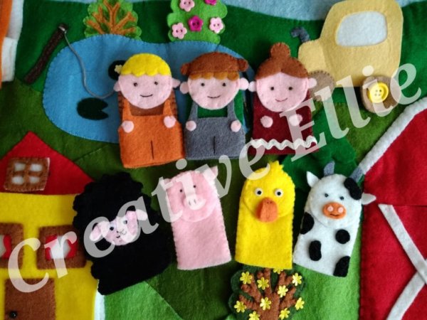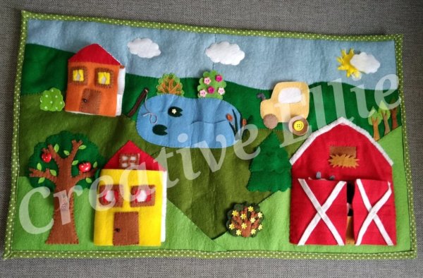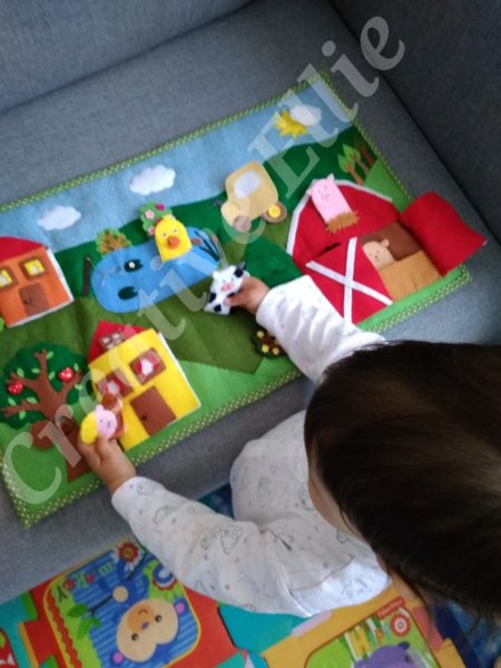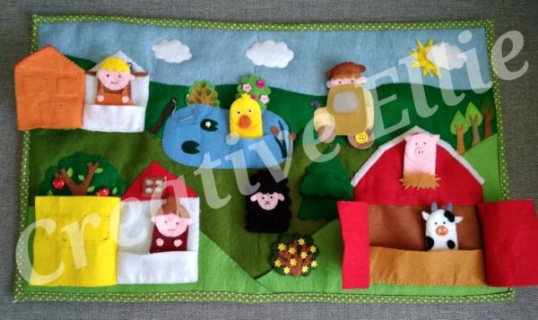 Jó munkához idő kell. A még jobb munkához pedig még több idő. Ezt a játszószőnyeget 7,5 évvel ezelőtt kezdtem el. Akkoriban találkoztam a Quiet Book (Csendeskönyv) fogalmával valamint a Pinteresttel. Rengeteg jó ötletet találtam, nagyon sok képet lementettem, ami azóta még sokkal-sokkal több lett. Arra gondoltam, hogy csinálok egy játszószőnyeget és/vagy falvédőt, amivel több angol gyerekdalt is el lehet játszani. Elsősorban a jövőbeli gyerekemnek gondoltam, de tanításhoz is lehet használni, ha úgy alakul. Az elején nagyon-nagyon lelkes voltam, aztán belassult a folyamat. Volt, hogy egymás után két évig elő se vettem. Volt, hogy néha varrogattam rajta valamit, főleg nyári szünetekben. De most, hogy Berni rákapott a bábozásra, tudtam, hogy végre be kell fejeznem. Így jött egy utolsó nagy hajrá és végre kész lett 🙂 Hét és fél év. Durva. De megérte. Ma is ugyanígy rendezném el a dolgokat. Az egész kézzel készült, csak a szegélyt varrtam géppel. Egyedül az istállóhoz használtam sablont, azt is kicsit átalakítva. Minden más saját ötlet volt.
